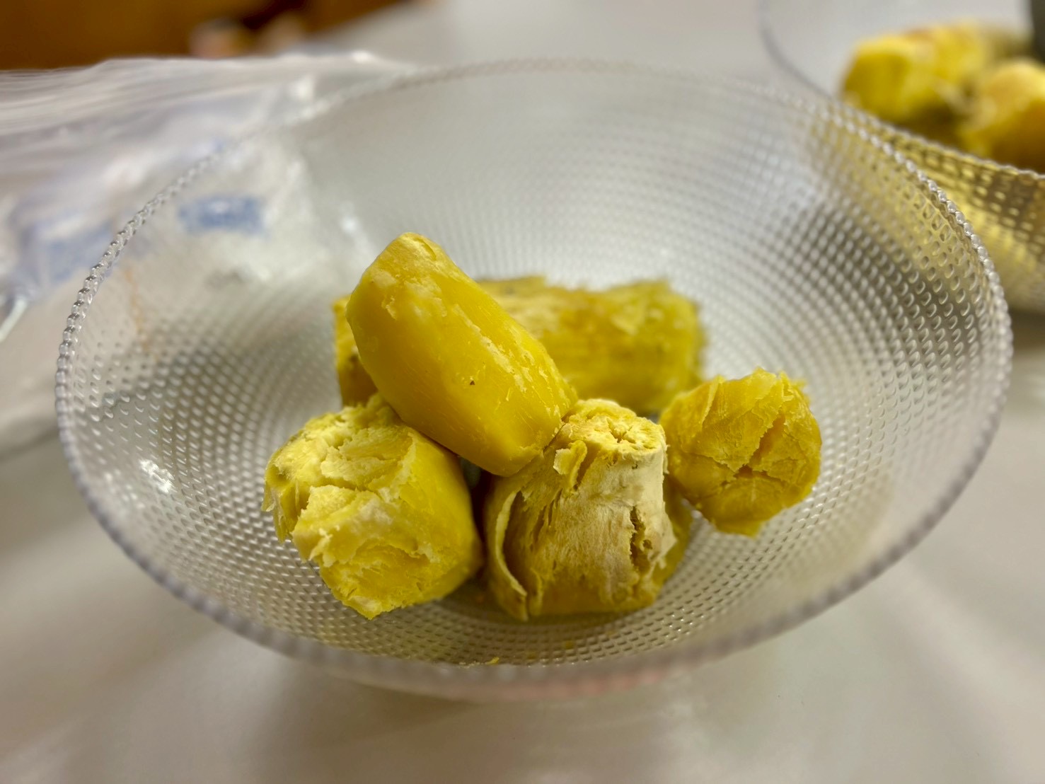 丁寧に潰すことで、舌触りのよい仕上がりになるため、面倒くさくてもがんばって潰していきます![]()