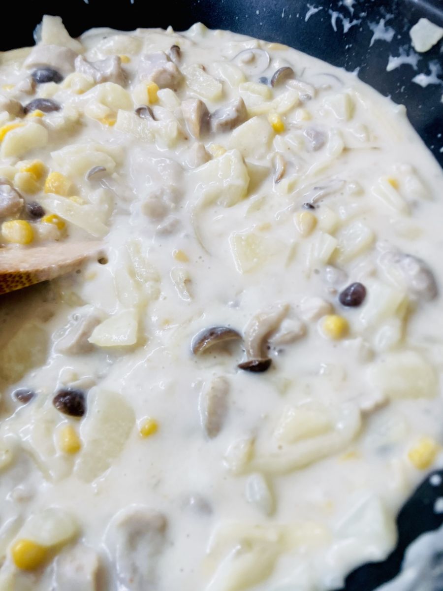 じゃがいもが柔らかくなったら、木べらで粗目につぶし、とろみがつくまでゆっくり混ぜていくのですが、この作業が地味に大変