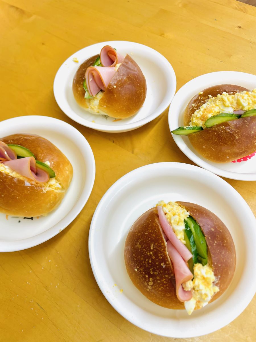 パンに切り込みを入れ、たまご、ハム、きゅうりを挟んでいきます。バランスが難しい~![]()