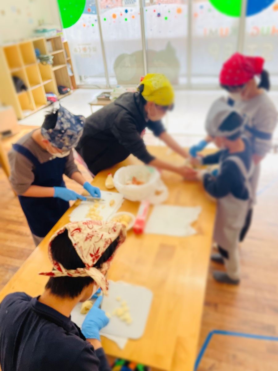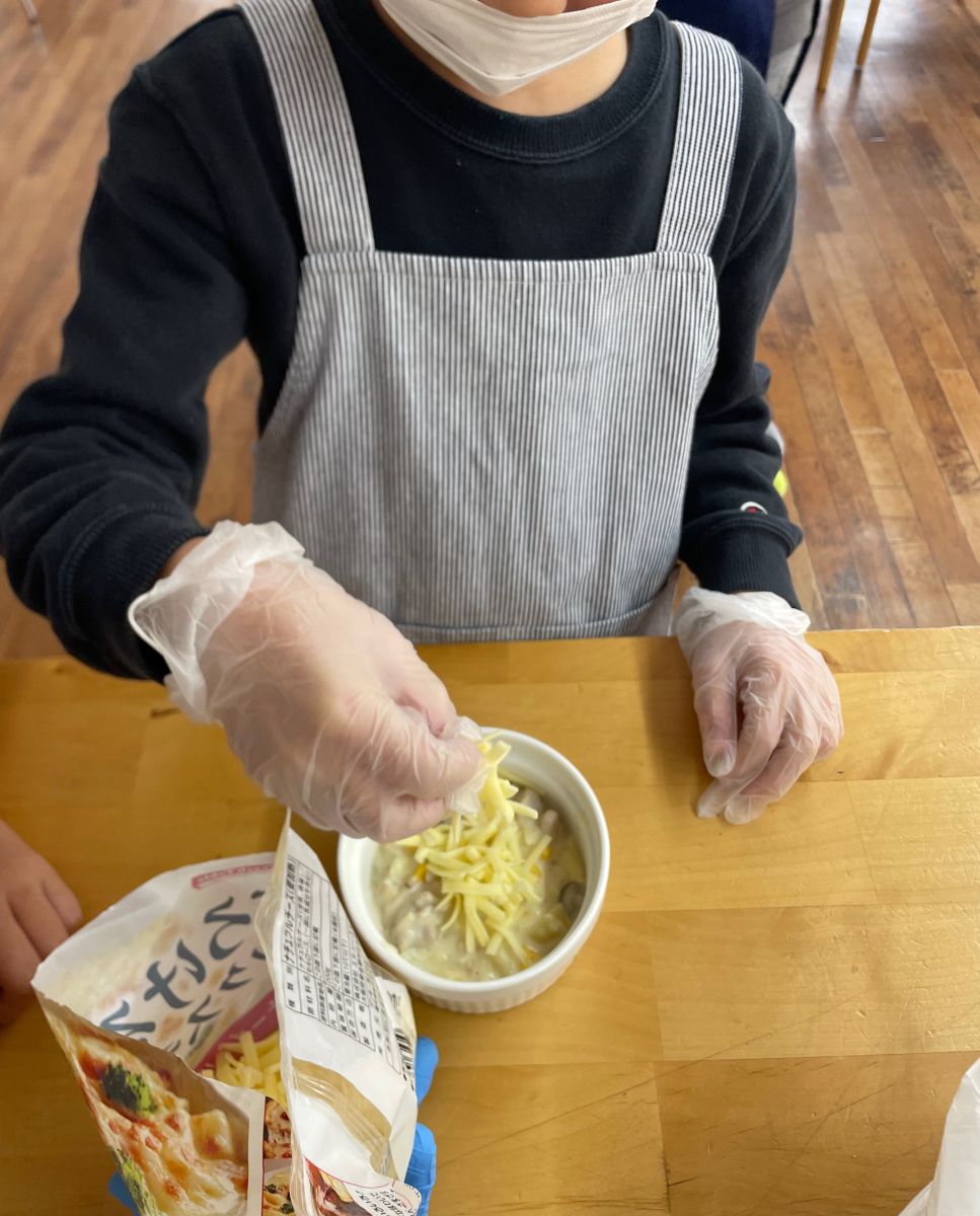 みんなで協力して、美味しいグラタンを作ろうね、と声をかけると、やる気満々で答えてくれました![]()