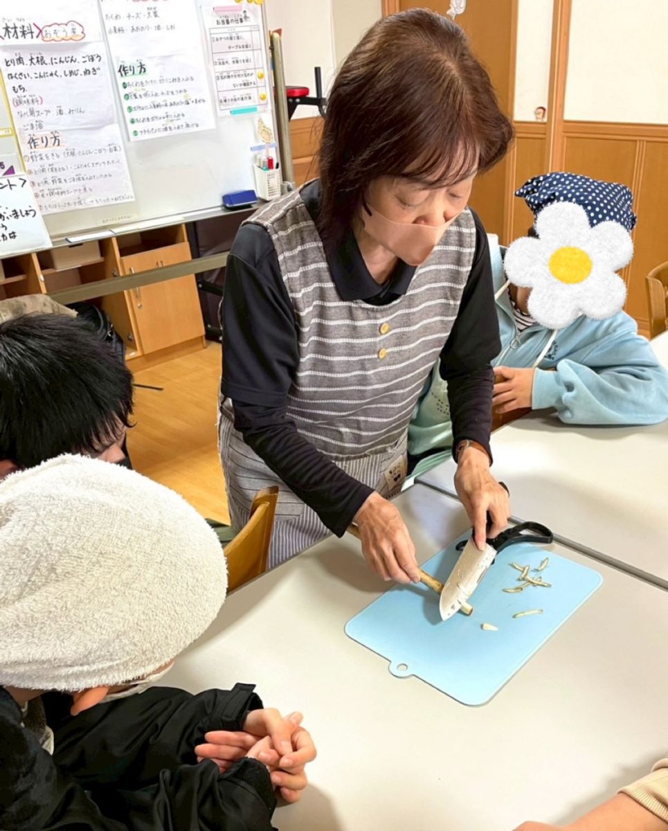 今回子どもはピーラーを使いましたが、包丁を使ったささがきごぼうの作り方を職員が見本で見せました。