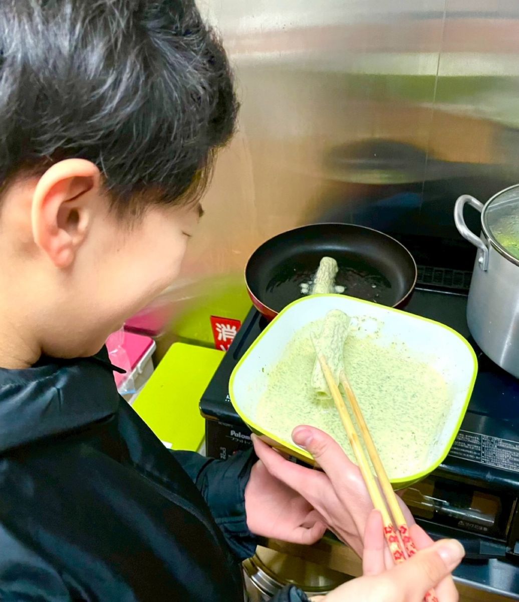 お雑煮を似ている間に、付け合せのちくわの磯辺揚げを揚げていきます![]()