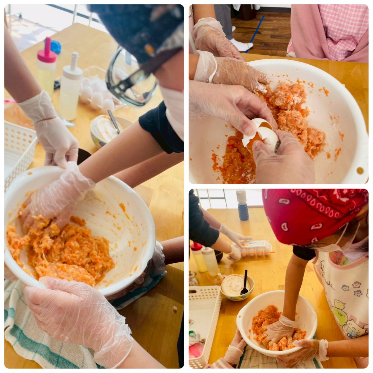 鶏団子の材料を合わせてよ〜くまぜます。楽しそう