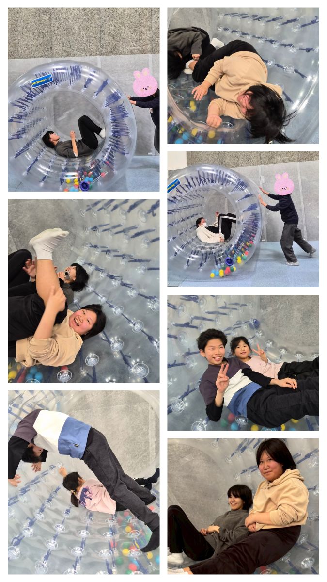 中に入って自分で転がることもできますが、少しレベルが高いのでお友だちや職員に押してもらい楽しみます![]()
