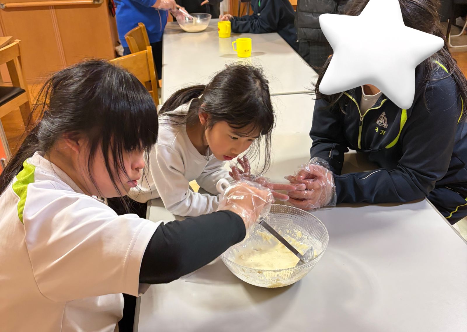 水と粉を1人20回ずつ順番に混ぜていきます![]()