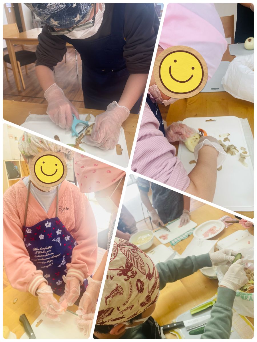 付け合わせのポテトサラダの材料とキャベツ、生姜焼きの玉ねぎをカット! 野菜を切るのが得意なS君、どんどん上達してます! Y君はきゅうりの種を丁寧に取り除いてくれました。