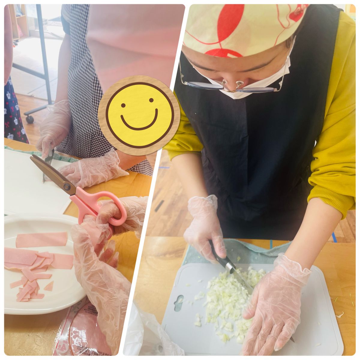 調理実習の参加間もない2年生のSちゃん。難しい作業はハサミを使います。 隣のベテランHちゃん、玉ねぎのみじん切りは大人顔負け!見事な包丁さばきです。